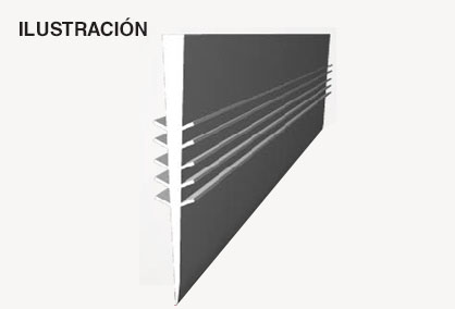 Junta para pisos de hormigón. Ofrece una solución efectiva para absorber el movimiento producido por la dilatación de los materiales, evitando la aparición de fisuras y grietas. Sus nervios laterales impiden que pueda ser extraída una vez fraguado el material de agarre.